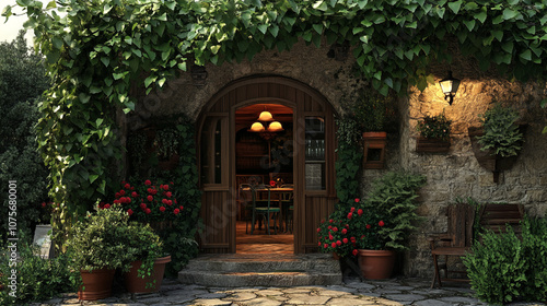 stone building, doorway, entrance, rustic, vintage, old, weathered, aged, ivy, greenery, plant, flower, red flower, wooden door, wooden frame, window, window, light fixture, lamp, light, chair, table, patio, courtyard, garden, cobblestone, stone, pavement, stone wall, architecture, house, home, exterior, building exterior, landscape, natural, peaceful, cosy, inviting, evening, twilight, ambience, atmosphere