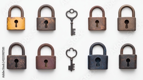 Rustic Vintage Padlock and Key Set Against White Background - A collection of rustic vintage padlocks with an ornate key depicting security, nostalgia, craftsmanship, uniqueness, and design elegance.