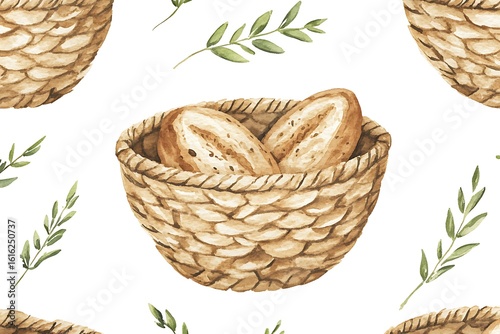 bread, basket, watercolor, brown, beige, tan, wheat, loaf, baking, organic, rustic, natural, hand-made, wicker, leaf, green, pattern, food, texture, design, vintage, country, kitchen, illustration, art, style, harvest, summer, floral, simple, elegant, calm, peaceful