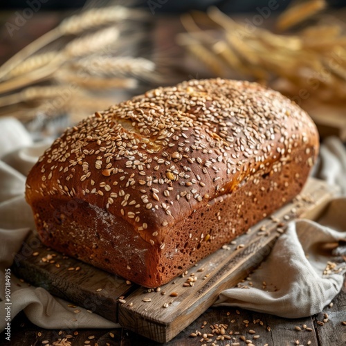 Rustic Wholesomeness: A Hearthy Whole Wheat Bread on a Wooden Board with Seed Toppings, Nestled in a Cozy Handcrafted Ambiance