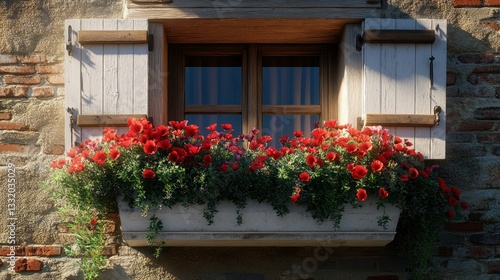 window, flower, red, garden, plant, rustic, vintage, exterior, house, home, charming, beautiful, design, decor, architecture, italy, europa, view, light, sunlight, shadow, windowbox, potted, bloom, detail, cosy, elegant, classic, traditional, style, decoration, ornament, wall, brick, shutter, wood, white, nature, patio, balcony, romantic, home decor, italian, european