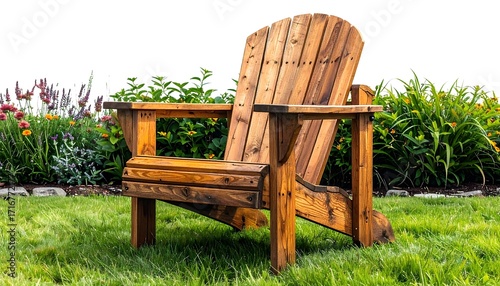 chair, adirondack, wood, rustic, slat, lawn, grass, garden, flower, natural, furniture, landscape, greenery, cosy, scenic, tranquil, hand-made, craftsmanship, design, backyard, environment, lifestyle, composition, visual, concept, minimal, warm, inviting, earthy, summer, relaxation, comfort, nature, bloom, peaceful, aesthetic