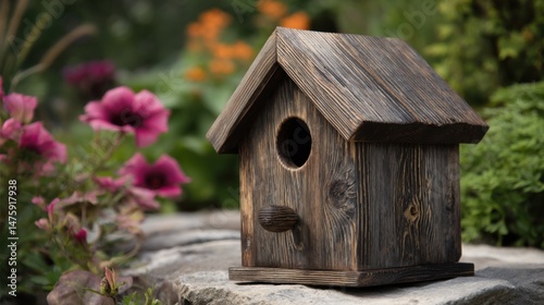 Rustic Wooden Birdhouse on Stone Surface in Garden Setting Close Up Nature Photography