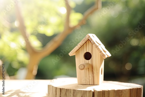 rustic wooden birdhouse perched on a tree stump in a natural setting. Generative AI