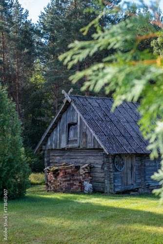Rustic wooden cabin nestled in a lush green forest, surrounded by tall trees and vibrant foliage, showcasing traditional architecture and natural beauty