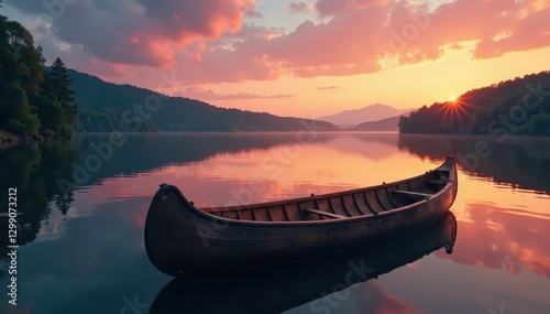 Rustic wooden canoe at tranquil dusk, serene water reflection , craft, quiet, canoe