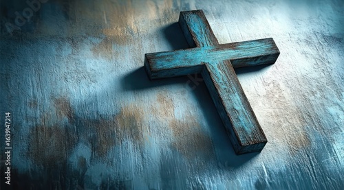 Rustic wooden cross with a weathered blue paint lying on a textured surface casting a soft shadow, evoking a sense of solitude and reflection
