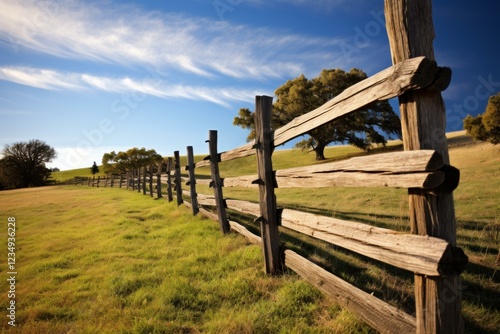 Rustic wooden fence winding through a vibrant green meadow under a clear blue sky, creating a peaceful rural landscape