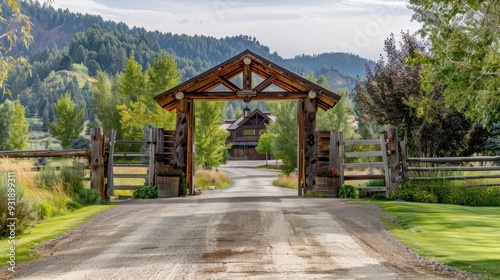 gate, ranch, house, wooden, mountain, countryside, driveway, rural, landscape, grass, tree, fence, wood, green, nature, farmhouse, estate, exterior, entranceway, rustic, architecture, summer, daylight, outdoors, sky, path, property, country, foliage, meadow, home, luxury, western, wildlife, peaceful, serene, calmness, tranquil