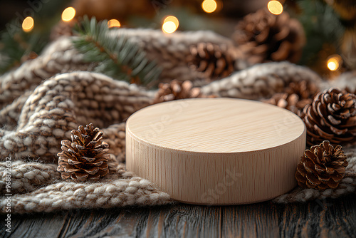 Rustic Wooden Pedestal with Pinecones, Greenery, and Red Berries, Natural Christmas Display, Festive Holiday Decor Background