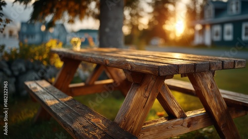 Rustic wooden picnic table in serene outdoor setting with warm sunset glow and nature backdrop