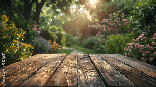 rustic, wooden, table, lush, garden, blooming, flower, sunlight, greenery, nature, scenic, tranquil, peaceful, backyard, summer, landscape, floral, natural, wood, foliage, bright, sunlit, plant, garden path, environment, serene, beautiful, idylli