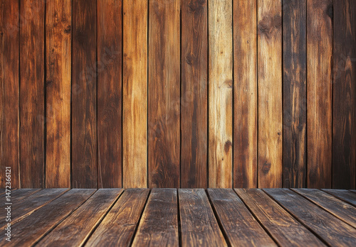 Rustic wooden wall and floor background, perfect for product display or design projects. The rich brown tones and textured wood create a warm and inviting atmosphere. : Generative AI