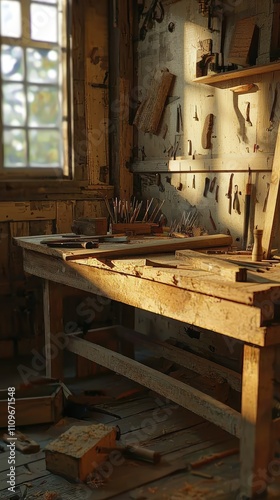 Rustic Workshop with Sunlight Streaming through Window, Highlighting Wooden Workbench Surrounded by Hand Tools and Creative Atmosphere for Craftsmanship