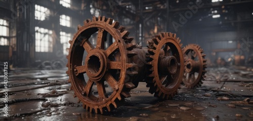 Rusting gears, dripping pipes in a derelict factory , infrastructure, bleak