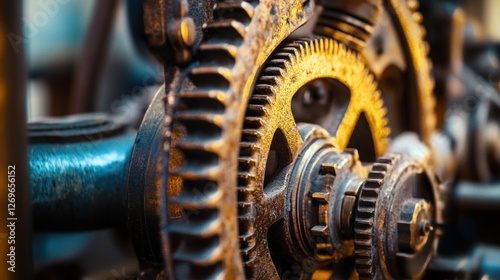 gear, rust-eaten, machine, old, metal, cog, mechanism, industrial, antique, technology, engineering, vintage, mechanic, part, component, intricate, complex, detail, texture, pattern, brown, gold, bronze, dark, shadow, light, close, up, macro, sharpened, depth, field, craftsmanship, history, time, work, power, movement, worked, design, aged, weathered, worn, teeth, wheel, shaft, bearing