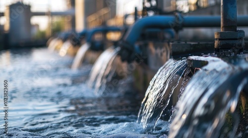 Rusty industrial pipes discharging wastewater into a nearby river, highlighting environmental pollution. Water contamination and environmental hazard evident in the scene