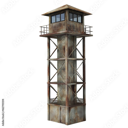 watchtower, tower, rust-eaten, rusted, metal, steel, old, weathered, abandoned, decay, corroded, lookout, structure, surveillance, military, guard, isolated, stair, staircase, architecture, observation, post, vintage, retro, industrial, grunge, gaol, security, elevated, ladder, outdoors, tall, cabin, dilapidated, decrepit, derelict, defense, sentinel, bunker, fortress, platform, aged, forgotten, desolate, patrol, cut-out, transparent, clipping path
