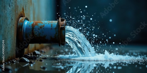 pipe, water, flow, stream, rust-eaten, metal, liquid, splash, droplet, bubble, foam, texture, surface, ground, blue, grunge, outdoors, industrial, plumbing, drainage, environment, nature