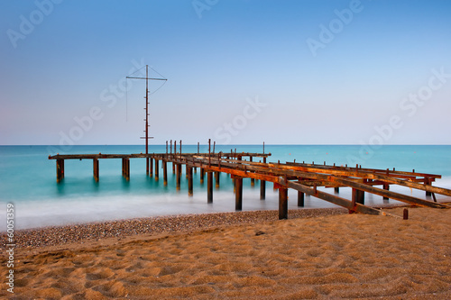 rusty skeleton of the old pier and turquoise sea