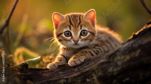 Rusty-spotted cat stalking her prey in Ceylon nature with one front paw raised. Small cat from wild Sri lanka keeps looking with his front paw lifted off the ground. Prionailurus rubiginosus phillipsi