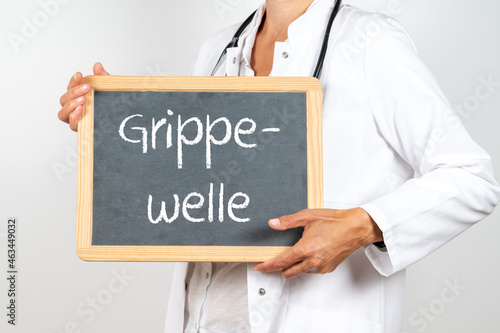 Ärztin mit einer Tafel auf der Grippewelle steht