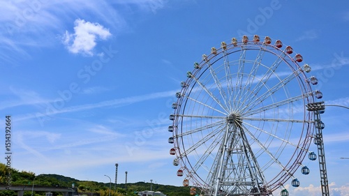 ferris wheel, summer, blue skies, sky, summer getaway, july, august, leisure, tour tourism, travel, funfair, attraction, blue, open air, sunny, facility, copy space, background, thunderhead, landmark, drive, wheel, fun, amusement, carnival, summer, high, big, yen, round, ride, park
