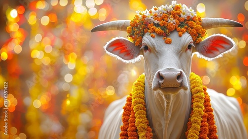 cow, animal, hinduism, holy, sacred, culture, tradition, religious, ceremony, india, festive, garland, floral, deity, decoration, celebration, vibrant, bright, hindu, purity, respect, bovine, domestic, farm animal, agrarian, rural, spiritual, belief, devotion, worship, festival, heritage, marigold, orange, white, ornate, headwear, adorned, bokeh, light