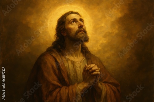 Sacred religious artwork depicting divine figure in moment of spiritual contemplation and prayer