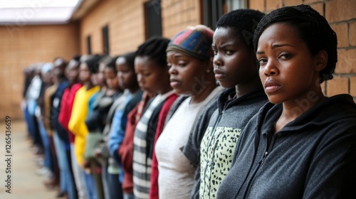 woman, african, sad, looking, camera, queue, group, row, diversity, society, people, crowd, line, waiting, concerned, community, social, issue, election, voting, portrait, face, expression, serious, emotion, ethnicity, africa, culture, human, building, brick, wall, outside, daytime, daylight, sunlight