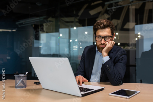 sad and depressed businessman in depression working inside modern office building, man in business suit with glasses and beard using laptop for work, boss disappointed with work result.