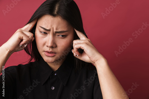 20s, adorable, appearance, asian, attractive, background, beautiful, brunette, charming, chinese, cute, female, friendly, girl, gorgeous, indoor, isolated, japanese, korean, nice, 1, person, portrait, posing, red, rejoicing, standing, studio, woman, young, teenage, teenage, serious, hand, gesticulate, displeased, negative, bad, stressed, cephalalgia, painful, pain, ill