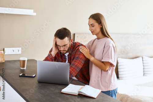 Sad dissatisfied man with thick beard dressed in red shirt, puts head on hand, reads unpleasant message, stares at laptop computer screen, portrait, indoor shot