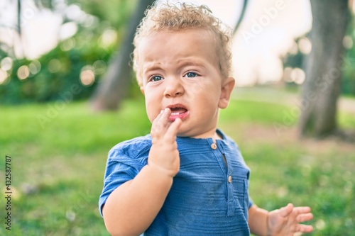 Sad little boy putting fingers on mouth touching gums because toothache at the park on a sunny day. Beautiful blonde hair male toddler in pain for new baby teeth outdoors
