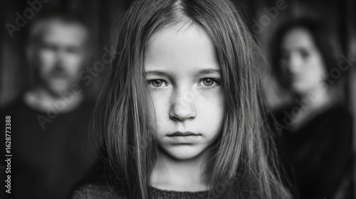 sad looking girl with her fighting parents behind her no logos no brands ar 169