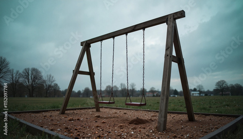 Sad loss empty swings in desolate playground under cloudy sky