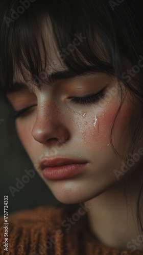 woman, sad, tear, emotion, portrait, face, eye, closed, soft, lighting, melancholy, grief, dramatic, closeup, beauty, emotional, expression, grieved, cinematic, realism, model, moody, thoughtful, delicate, feeling, loneliness, isolation, female, sorrowful, sensitivity, light, close, personal, aesthetic, introspective, still, gentle, intimate, subdued, character, wet, crying, vulnerable, dreamy