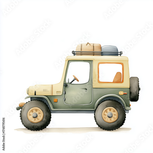 jeep, safari, adventure, travel, car, watercolor, illustration, baggage, vehicle, transportation, journey, exploration, expedition, discovery, vacation, holiday, trip, nature, cartoon, drawing, art, painted, vintage, retro, classic, cute, childhood, simple, graphic, design, white background, isolated, cut-out, half face, green, beige, brown, wheel, love handles, steering wheel, no people, freedom, road trip, tour tourism, destination, discover