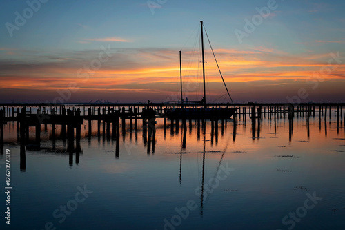 sunset, sailboat, marina, dock, water, silhouette, ocean, sea, harbor, sky, cloud, evening, twilight, calm, peaceful, sailing, pier, nautical, travel, coastal, horizon, scenic, tranquil, serenity, ship, moored, still water, golden hour, dusk, landscape, outdoors, maritime, boating, adventure, exploration, relaxation, dreamy, waterfront, nature, soft light, warm tones, romantic, scenic view, daphne, alabama, us