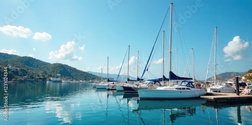 Sailboat docked at marina with calm waters below, water, harbor, serene