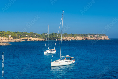 holiday, majorca, sailboat, yacht, sailing, boat, sea, ocean, water, summer, travel, vacation, holiday, tour tourism, beach, coast, coastline, island, spain, mediterranean, landscape, seascape, nature, scenery, blue, turquoise, sky, sun, sunny, clear, calm, tranquil, peaceful, idylli, paradise, luxury, lifestyle, adventure, exploration, freedom, moored, anchoring, cala, balearic islands, island, europa