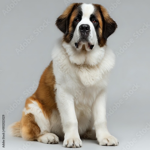 saint bernard, dog, puppy, purebred dog, canino, pet, animal, mammal, tricolour, furry, fluffy, cute, adorable, sitting, portrait, studio shot, grey background, isolated, pedigree, veterinary, loyal, friendly