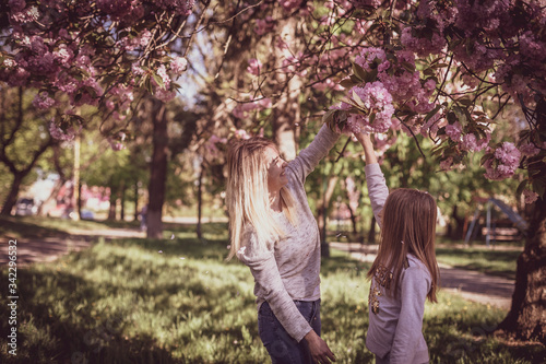 Sakura blossomed. Young mother with her child have fun in the park near the sakura. Spring morning. They look at each other