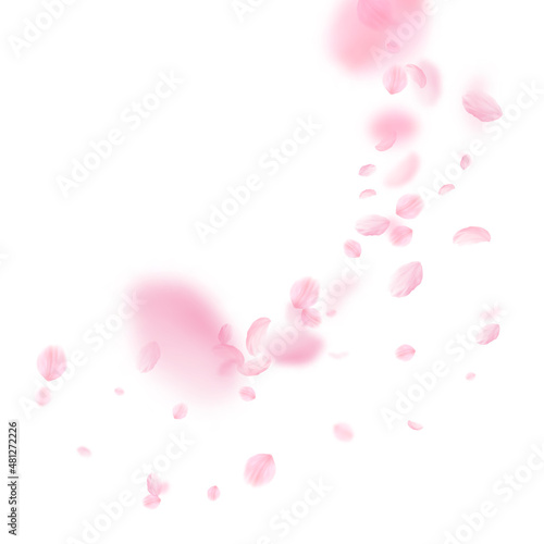 Sakura petals falling down. Romantic pink flowers corner. Flying petals on white square background. Love, romance concept. Surprising wedding invitation.