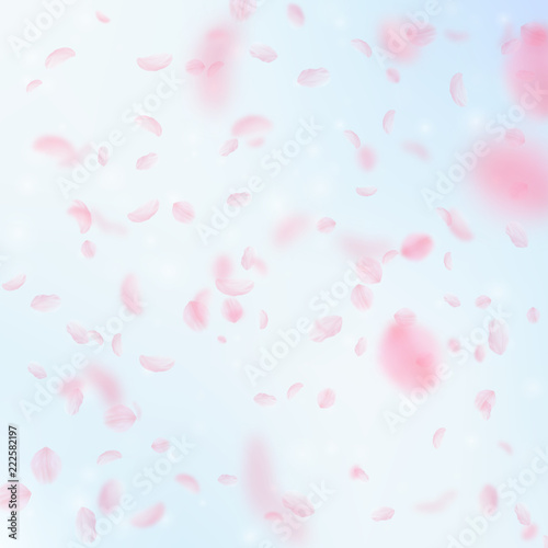 Sakura petals falling down. Romantic pink flowers falling rain. Flying petals on blue sky square bac