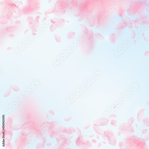 Sakura petals falling down. Romantic pink flowers falling rain. Flying petals on blue sky square background. Love, romance concept. Great wedding invitation.