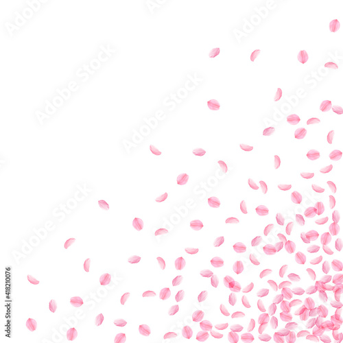 Sakura petals falling down. Romantic pink silky small flowers. Thick flying cherry petals. Scattered