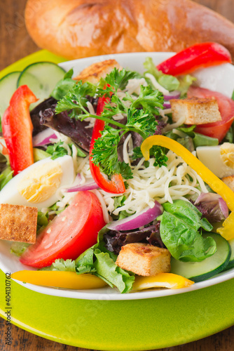 Salad. Garden Salad. Classic American or French restaurant salad made with kale, Arugula, almonds, blueberries, walnuts, tomatoes, bacon, blue cheese, eggs, avocado, tossed with olive oil.