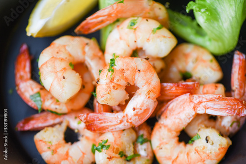 Salad shrimp grilled delicious seasoning spices on bowl appetizing cooked shrimps baked prawns Seafood shelfish with lemon and lettuce
