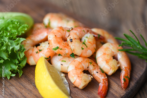 Salad shrimp grilled delicious seasoning spices on wooden cutting board background - appetizing cooked shrimps baked prawns , Seafood shelfish with rosemary lemon and lettuce